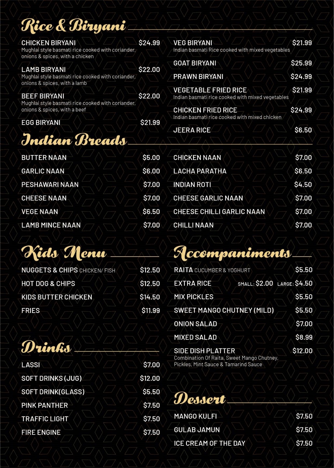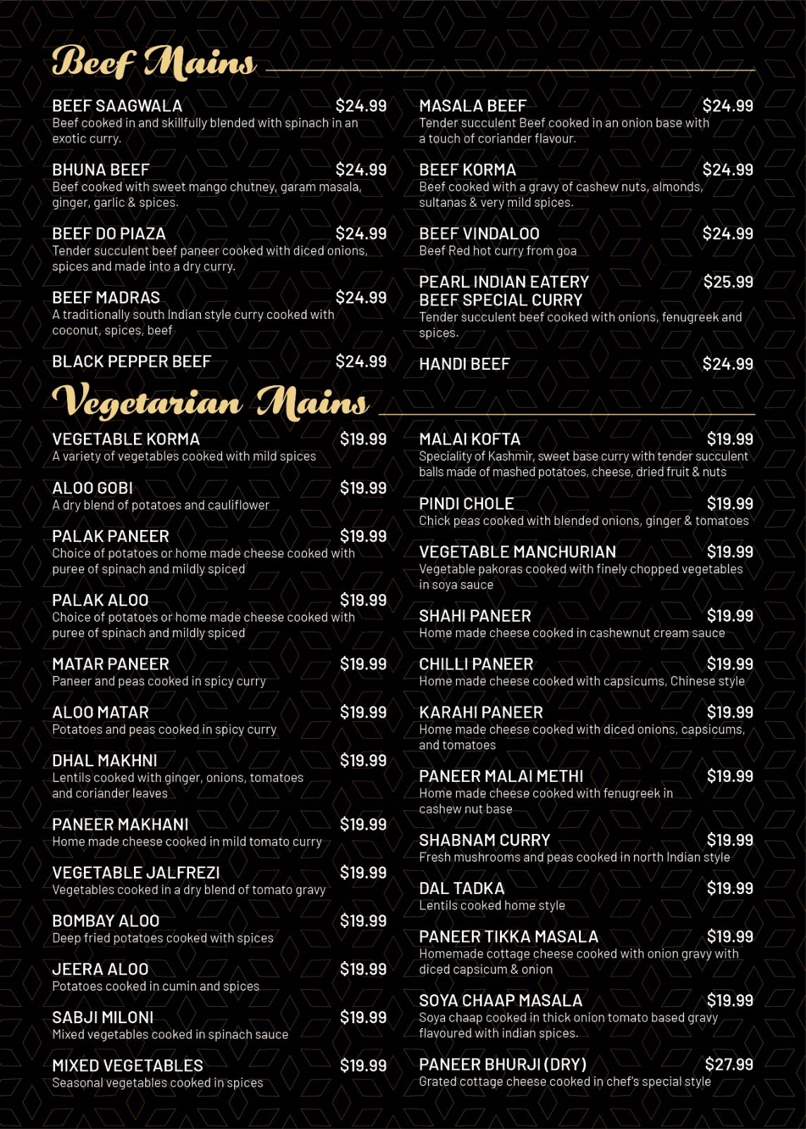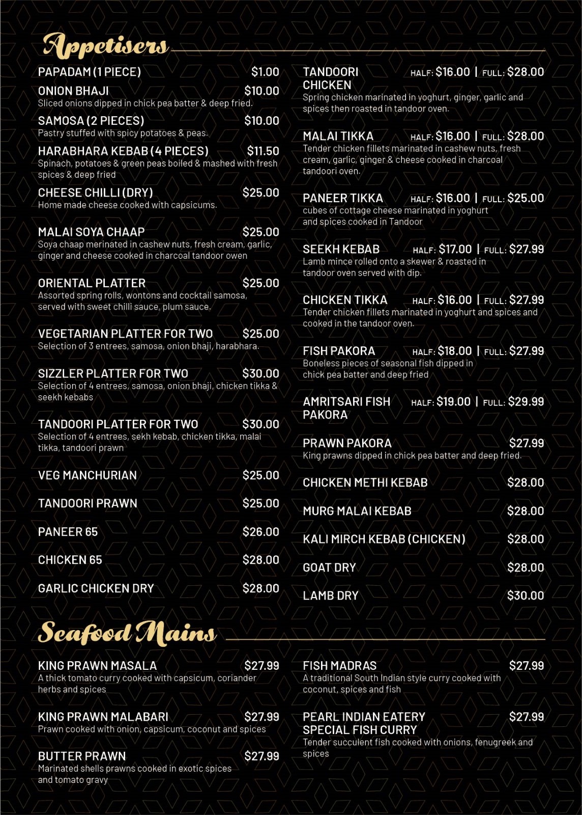 Menu from Pearl Indian Eatery